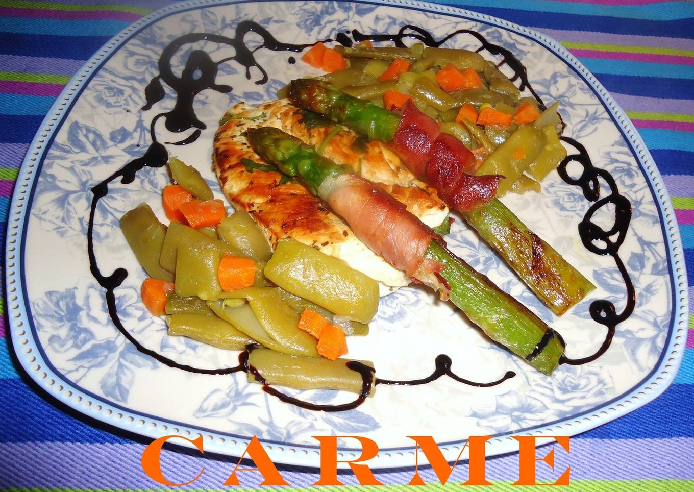 Tengo dos versiones, la de la pechuga, solo con los esparragos y la de plato único, acompañada también de la verdura que era el primer plato.
